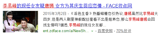 唐嫣与李易峰主演的电视剧《活色生香》播出,唐嫣谈李易峰:“李易峰还是个大男孩,我把他当成弟弟,拍《活色生香》《盗墓笔记》这种姐弟情也让我们的感情戏没有障碍”。