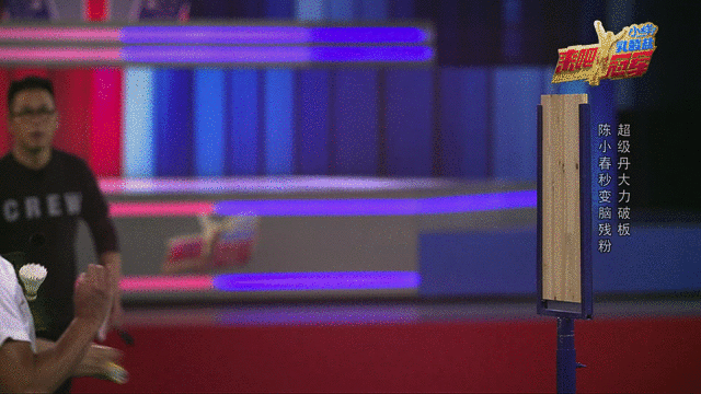 “超级丹”联手世锦赛女双冠军王晓理,展示羽毛球绝技,“击穿松板”羽毛球如子弹一般疾速打破12毫米厚度的松木板,球拍和羽毛球都被打破,杀球速度和力量令人震骇。