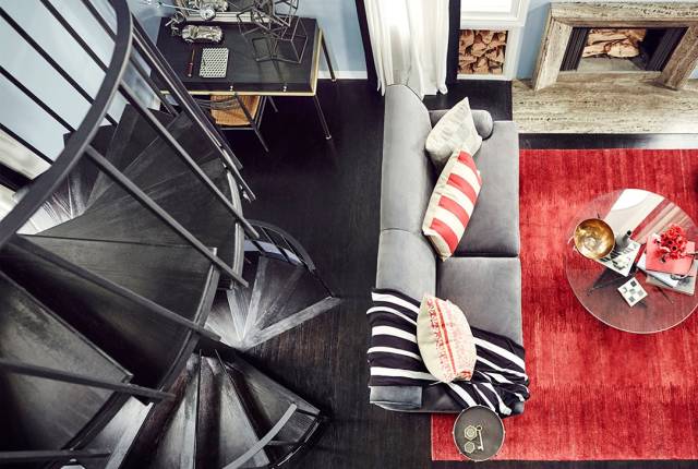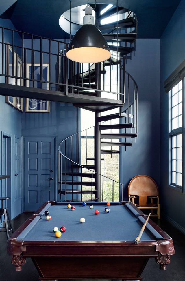 当从上至下的黑色铁艺楼梯贯穿整个空间,蓝色的墙面就像一个幕布,整个空间就像电影场景那般,留给人的是经典与不凡格调。