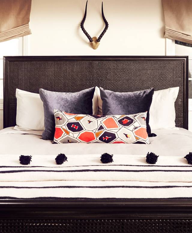 在主卧室中,设计师并没有选择使用蓝色调,而是选择了更加温馨的棕色调,以及明亮的白色,点缀上经典的黑色,别有一番味道。床头的鹿角装饰,复古的电话机,无处不在的细节彰显主人的不凡品味。