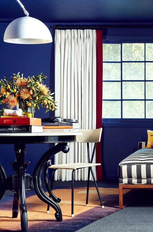 沉静如海的蓝色墙面与鲜艳的红色地毯,