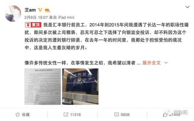 据微博网友@芝am 描述,自己是前汇丰银行员工,2014年至2015年其遭遇长达一年的职场性骚扰。
