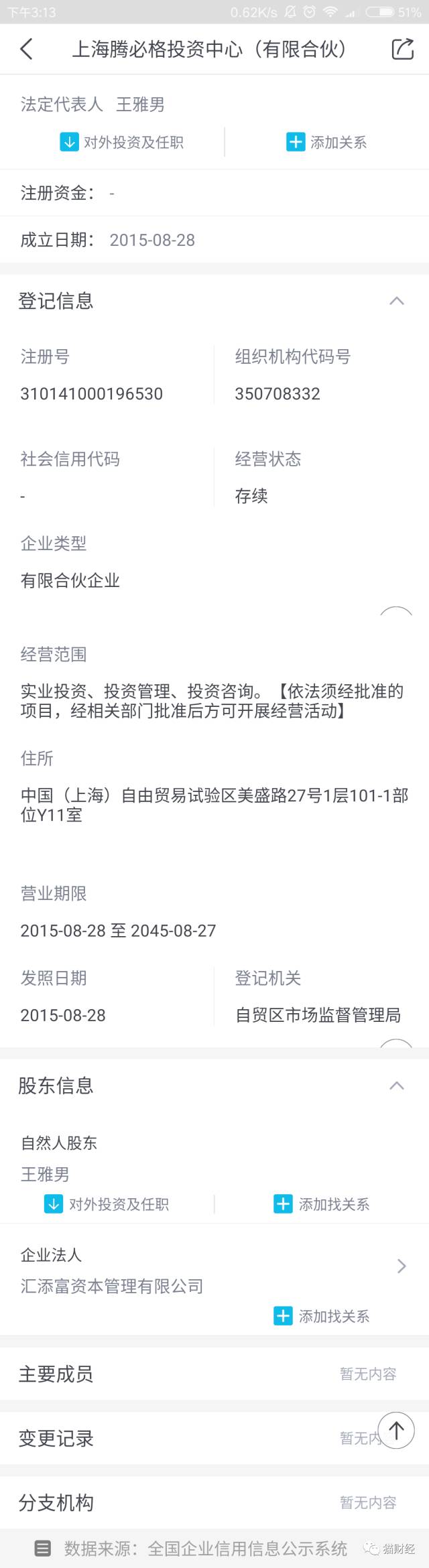 猫妹查阅全国企业信用信息公司系统,发现王雅男就是这间公司的法定代表人,经营范围为实业投资、投资管理、投资咨询。