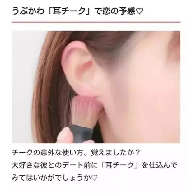 耳朵腮红,最初由日本彩妆大师滨田胜提出,模拟女孩子害羞时模样的腮红打法。把粉红色的腮红直接打在耳廓和耳垂上,让人有一种害羞到红了耳根,营造羞涩的又可爱的感觉,直接激发了男神的保护欲有没有!