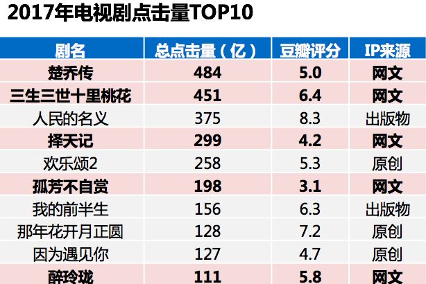 在这方面华策也做得不错。根据相关数据,2017年播出的电视剧点击量数据中,前三名分别是《楚乔传》《三生三世》和《人民的名义》,播放量分别达到484亿、451亿和375亿。