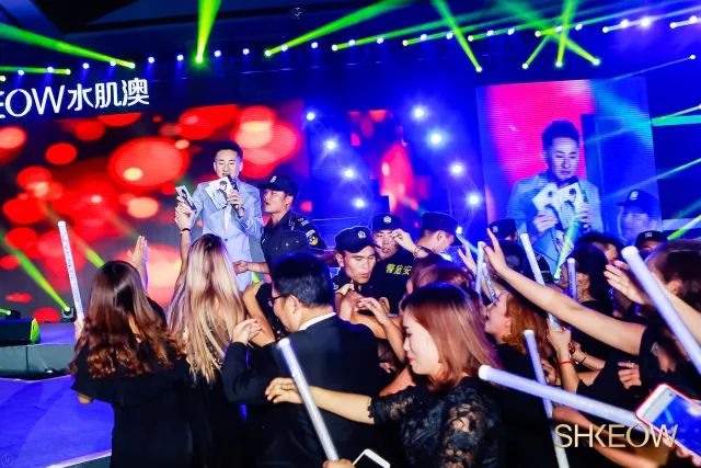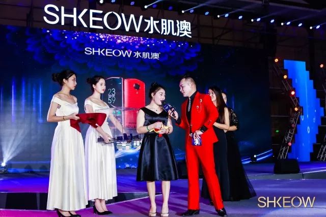 现场灯光四射,异彩纷呈,一个个新品由外国名模手托产品劲爆展现,全面接轨国际化潮流,带你领略超震撼新品秀场。随后新品启动仪式惊艳上演,澳华集团董事长及公司骨干人员携手王禹童一起为水肌澳新品全球首发倒入冰雕字注香槟,将现场新品火爆气氛再次推向高潮。