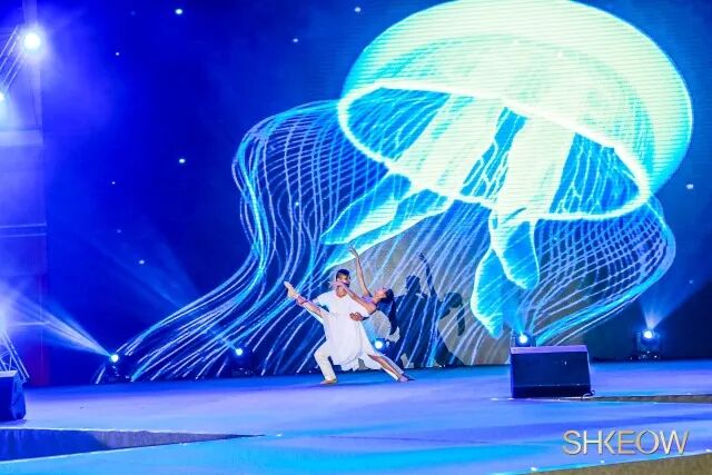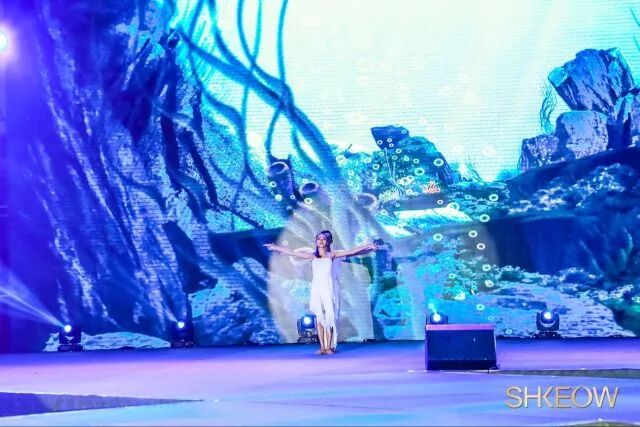 柔美惊艳的双人舞蹈正式开演,以代表澳华集团旗下品牌水肌澳核心灵感的深海植物为背景,涌动的天蓝色,深海里游动的植物,在柔美的舞蹈中将水肌澳的品牌理念尽情展现。
