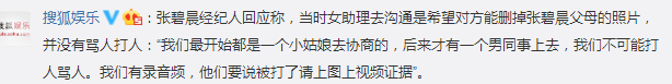 下午的时候张碧晨在微博表示,回个家和爸妈吃饭有啥可拍的?狗仔下车先挑衅吐口水的,至于说脏话,自己可是从小被爸妈教育的四好青年。