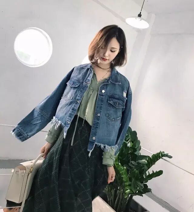 周冬雨以Topshop高领针织衫打底,外搭浅色牛仔夹克和“抹茶绿”纸袋裤,酷炫又俏皮,青春感十足。