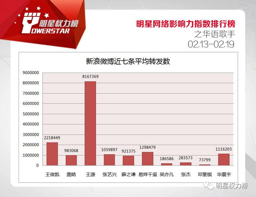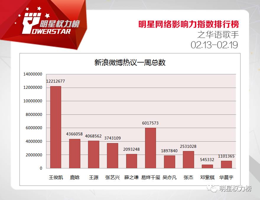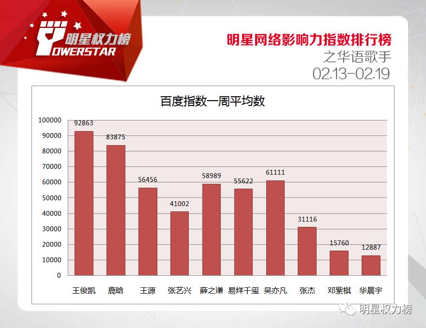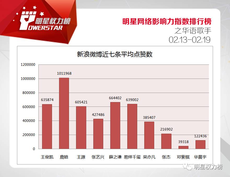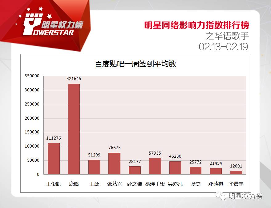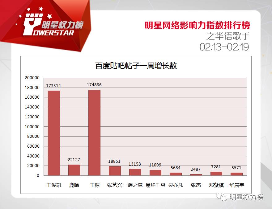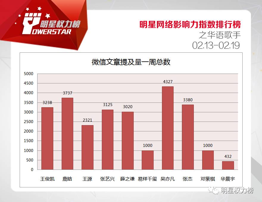明星网络影响力指数排行榜第101期榜单之华语歌手Top10 明星权力榜 内地男星 2017-02-27 23:39:29 485 创作不易,用心坚持,欢迎请BaGua喝几杯爱心咖啡!打赏并支持本文 打赏并删除本文 ▲ 点击蓝字,关注中国第一明星新媒体明星权力榜用数据说话 与粉丝同行本期榜单【#明星网络影响力指数排行榜#】第一百零一期榜单之华语歌手Top10:NO 1.王俊凯 NO 2.鹿晗 NO 3.王源 NO 4.张艺兴 NO 5.薛之谦 NO 6.易烊千玺 NO 7.吴亦凡 NO 8.张杰 NO 9.邓紫棋 NO 10.华晨宇 ( 百度指数、微博热议度、媒体报道量第一:王俊凯;贴吧活跃度第一:王源;微博互动率、贴吧签到数第一:鹿晗;微信提及量第一:吴亦凡 )中国第一明星新媒体长按指纹识别二维码,关注更多独家娱乐内容88点击“阅读原文”,更多精彩内容哦~ 创作不易,用心坚持,欢迎请BaGua喝几杯爱心咖啡!打赏并支持本文 打赏并删除本文 感谢您的支持鼓励,我会继续努力的!文章地址:用户邮箱:打赏金额:USDT 请输入数字点击”去打赏“,即可进行打赏支持本文章哦 王源 About the Author 明星权力榜 功能介绍:“ 明星权力榜 ” 以真实数据为依据,通过专业科学的评判方式,对演艺圈各大领域明星的影响力进行综合排名 官方认证:上海梓霄文化传媒中心 Related Posts 父女恋终于崩了? 2022-09-05 22:07:47 榜妹热线 | 王一博被嘴内幕?许凯密逃常驻?黄晓明尹正cp复活?李兰迪错失上升期?周洁琼开机? 2022-07-29 22:01:57 榜妹热线 | 肖战演技、刘亦菲没戏拍、宋祖儿王安宇合体、吴昕失业、刘宇资源差 2021-12-31 22:08:39 榜妹热线 | 赵丽颖新剧男主、罗云熙动态、林更新人设、宋雨琦《奔跑吧》、夏之光恋爱 2021-07-23 22:01:46 快讯 | 迪丽热巴美图、王源大片、黄景瑜封面、黄明昊杂志 2021-02-18 22:13:21 发表评论
