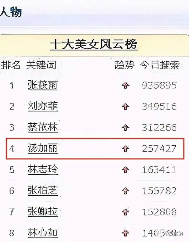 她也真正地实现了自己的明星梦想,和刘亦菲,张柏芝,林志玲等美女不分上下,甚至比他们的热度还要高。当年的网络热搜上,汤加丽在“十大美女风云”榜上,比林志玲和张柏芝的排名还要靠前,而排在第一的是比她还要狠的张大美女。