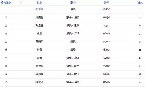 先用公开排名镇个楼,2015年福布斯中国名人榜,周杰伦排名第二,以下为前十榜单截图: