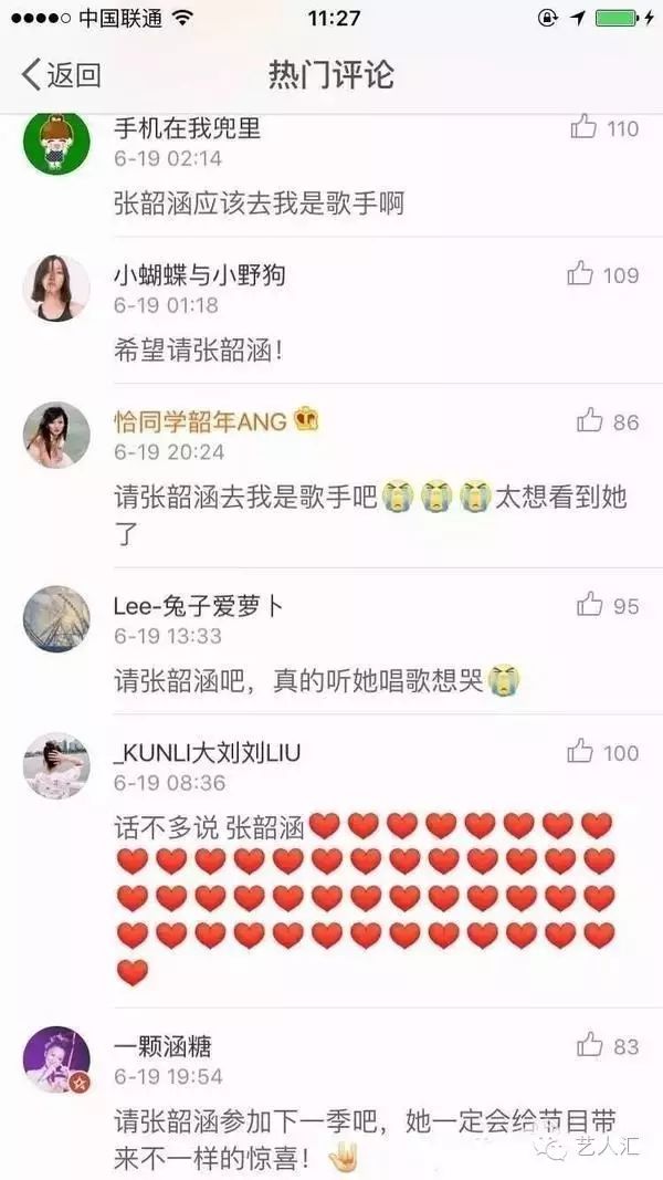 然后我是歌手的微博就沦陷了。。。被张韶涵的粉丝包围了。张韶涵真是一嗓惊醒梦中人啊!!!