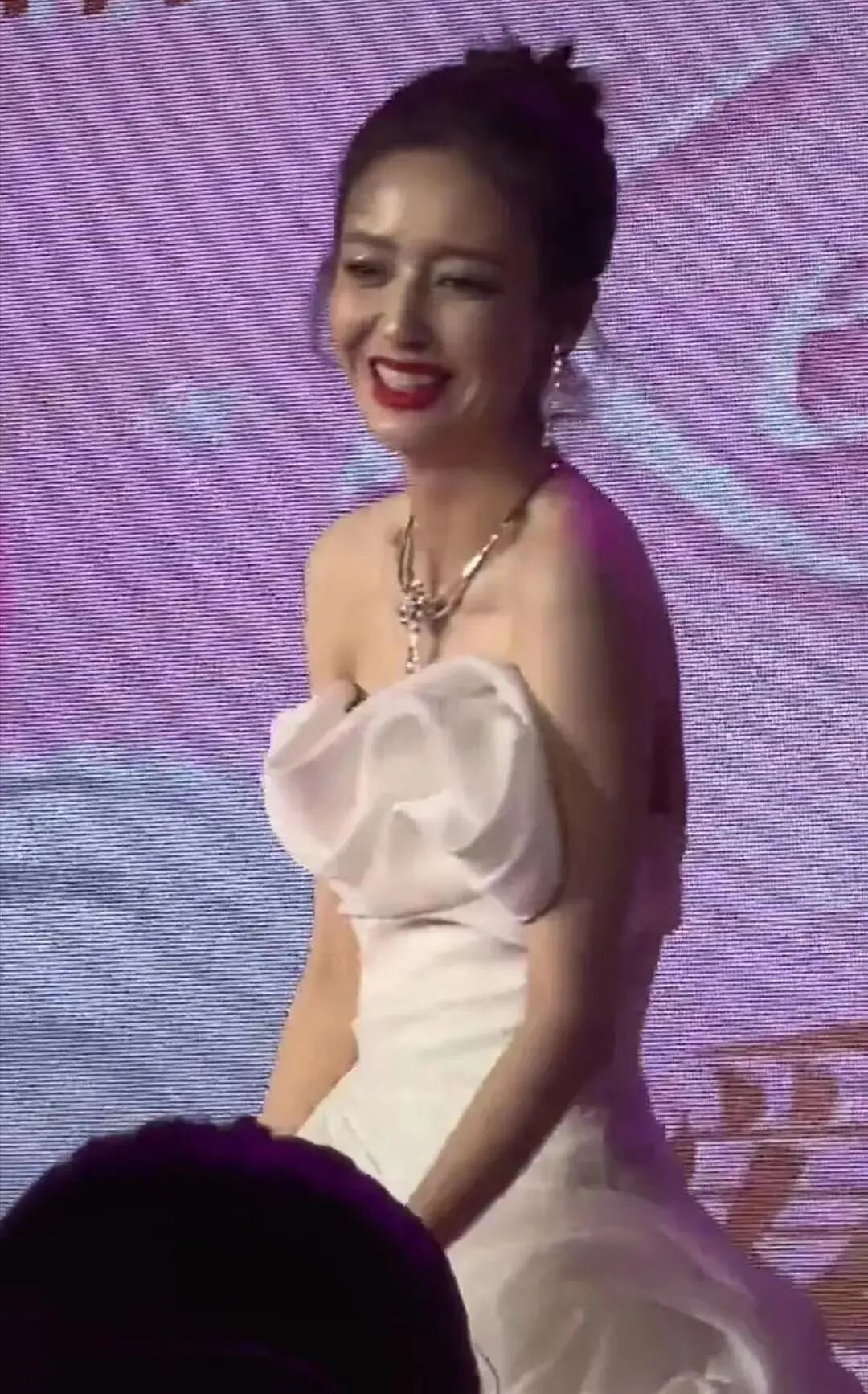 可能是每个人的审美不同吧。她的这件黑色礼服穿在她身上其实并没有那么好看,再加上这件衣服独特的设计。导致她这个人和他的背景融为一体了,造成身体失踪的效果,非常的奇怪。而且还有这光线的原因,把她的脸照得非常的黝黑,整个人的状态也真的是太难堪了吧。