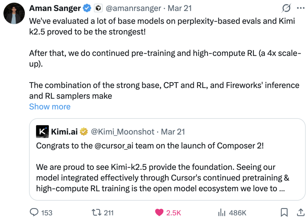 Cursor 创始人公开致歉并承认 Kimi K2.5 是其测评中“最强的基座模型(Strongest base model)”,是其核心产品的灵魂。