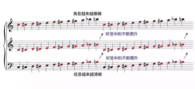 其玄机就在于随着音调的增高,最高调的音调变得更加安静,中间音调保持响亮,最低音调是逐渐变得可以听见的。当保持在相对频率间变化时就会出现永无休止要到达某一高点或低点的幻觉。