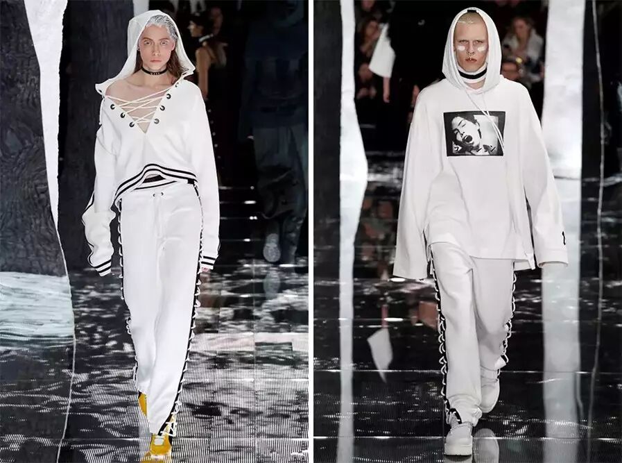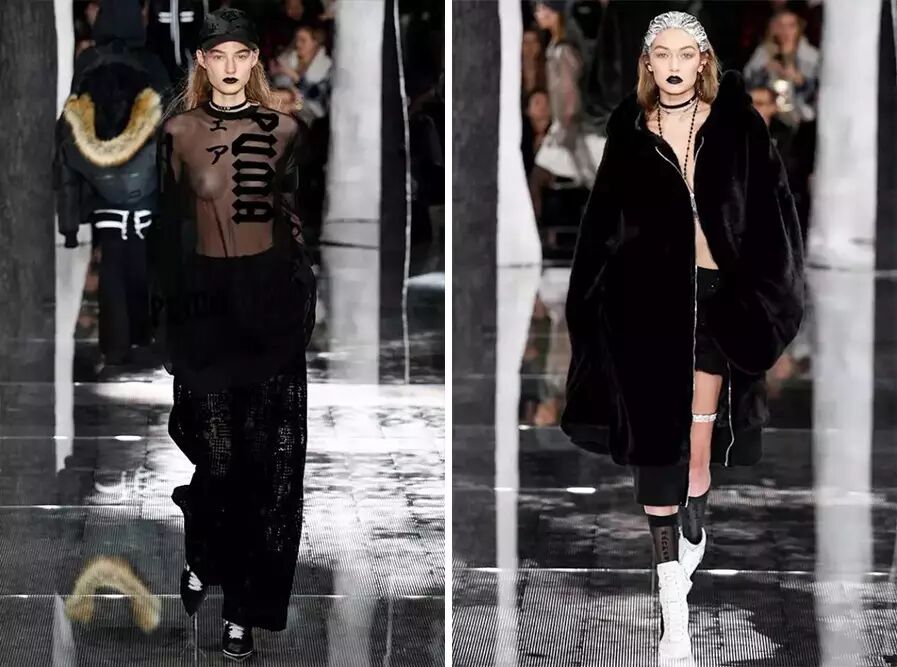 回顾完riri的狂野进化史,再说回riri首秀的作品,这次入驻 PUMA 无疑是十分成功的,其充斥着前卫、张扬、 Bad Girl 气息的 FENTY x PUMA by Rihanna 2016 秋冬系列,无论是宽松剪裁的卫衣、露肩oversize Bomber 夹克,还是 Cropped 的帽衬,又或是日文字样透明上装与袜装,件件单品都是极致彰显了Riri 的独有味道!更邀请到超模Gigi Hadid来走秀,girls rock!