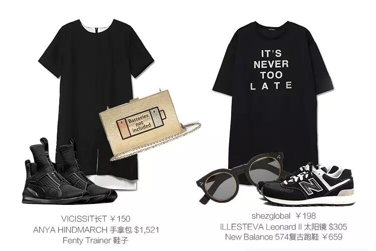 ► 字母或者头像 Long T-shirt ,型格搭配短靴和球鞋。长T虽好,但不宜过膝,太长不显性感反而显矮(瘦子除外),太短的话最好搭个热裤或者legging。若嫌太单调,可搭配亮色帽子、墨镜、项链、手拿包或者手提包来提亮点。但切忌背挎包和双肩包,因为.....会把衣服撩起来。