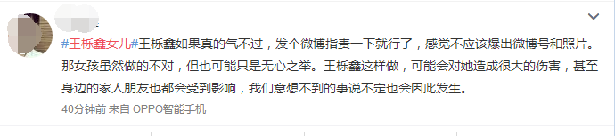 但是这曝光网友隐私的行为却遭到一下玻璃心网友的谴责“作为公众人物实在不妥”、“对女儿的成长不好”。随后可能也是因为一票网友的非议,王栎鑫也删除了该微博。