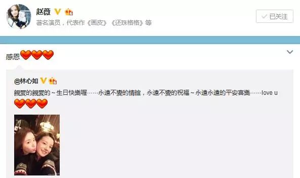 ▲林心如发微博送生日祝福,赵薇感恩回应