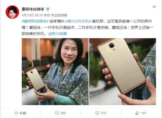 格力董事长董明珠在微博上曝光了格力2代手机的真机照,金色外壳、窄边框、大屏幕,同时暗示这将是一部完美的手机。而据此前媒体曝光信息,格力2代或将搭载骁龙820处理器、售价在3000元左右,可能会在四五月推出。