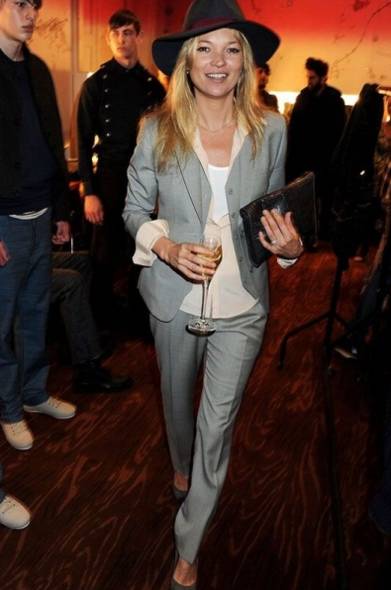 Kate Moss时尚界的传奇超模Kate Moss出席2011年伦敦时装周的男装秀,為了呼应主题,她自己也穿起了男装,灰色西装外套、裸粉色衬衫以及白色的内搭上衣,多层次与聪明的顏色搭配,加上黑色的绅士帽,让其他男模身上的男装都相形失色。