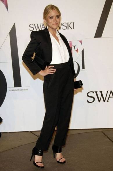 童星出身的Ashley Olsen已经不再演戏,转而将重心放在时尚界,并与自己的双胞胎妹妹 Mary-Kate Oslen共同创办时装品牌The Row,且将其经营得有声有色,在时尚界有著不可替代的地位。Ashley Oslen在2008年出席CFDA时尚奖时穿著自己所设计的西装,深V的衬衫露出一点肌肤,却也不至於暴露,加上西装外套特殊的肩线设计,以及高腰的宽裤,令大家纷纷对她的穿衣品味竖起大拇指。