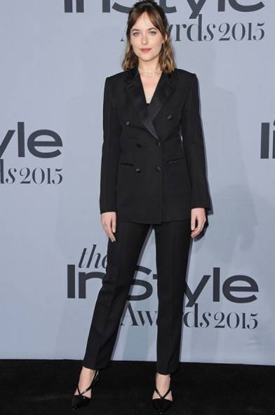 Dakota Johnson穿上全黑西装及黑色燕尾尖头高跟鞋,看起来是不是与她电影中甜美的样子非常不同呢?