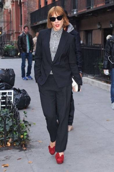 纽约女星兼时装设计师克Chloe Sevigny穿著飞鸟纹衬衫,外头套上Oversized西装,踩著一双打了个蝴蝶结的艳丽大红厚底高跟鞋,与她的唇彩相互呼应,再戴上时尚的猫眼墨镜,还有谁可以跟她媲美?