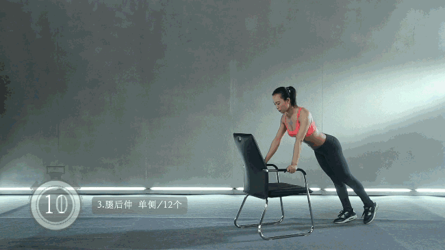 这个动作就显得比较轻松点,双手撑在椅子边沿,左脚往后抬,与地板水平即可,然后换右脚,一侧12个。