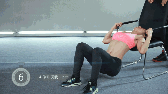 胸部以上部位躺在椅子上,双手抓着椅子边,使臀部尽量往上抬,直至身体水平。这个动作重复12次。