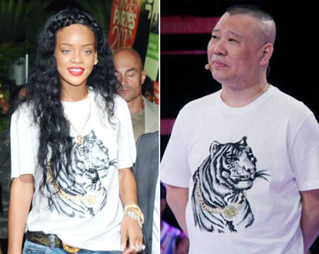 蕾哈娜上身演绎出了一种前卫时尚感,郭德纲老师穿出了一股浓浓的淘宝风……就算蕾哈娜有大金链子加持,还是没有郭老师的壕气~