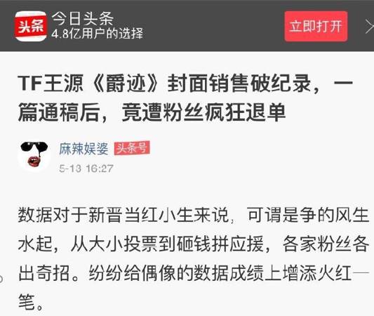 娱乐圈当红童星王源(16岁)日前因参演将在暑期上映的影片《爵迹》拍摄一线五大刊《时尚COSMO》的群封,并以“00后首位登上五大刊的男星”“最年轻的一线封面人物”等话题荣登新浪热门话题。网络单人封面的销售让希望给王源毕业礼物的粉丝们“飚上了车”,在48秒钟狂售7万余册,销售额达140多万至今无人退货,这种行业绝无仅有的记录顿时引起了大量公关行业与广告商的关注,与此同时带来却是粉丝没有预料到的营销号以及不经过新闻真实性审核便发布的“今日头条”的恶意打击和诽谤。