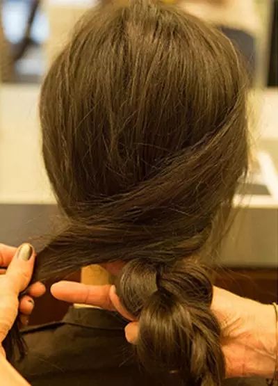 STEP3:分别将左右两边的头发缠绕着麻花辫的发根。