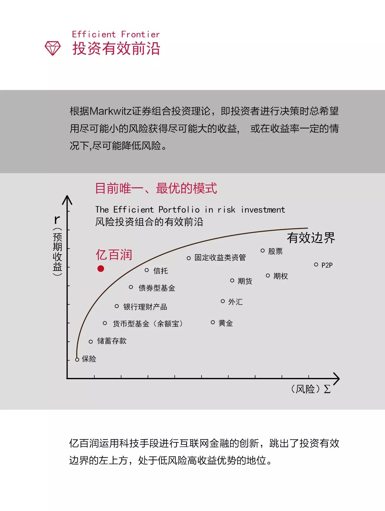 亿百润作为国内创新型第三方金融服务平台,致力于改善国人理财环境,提升全民理财质量,专注于为精英人士提供安全有价值的投资理财服务。亿百润线上产品皆受国家银监会和证监会监管,产品以债券为主,收益稳定、安全性极高。平台由金融与IT行业资深精英历时三年联合打造,并与谷歌合作完善云金融技术,系统把控投资风险。