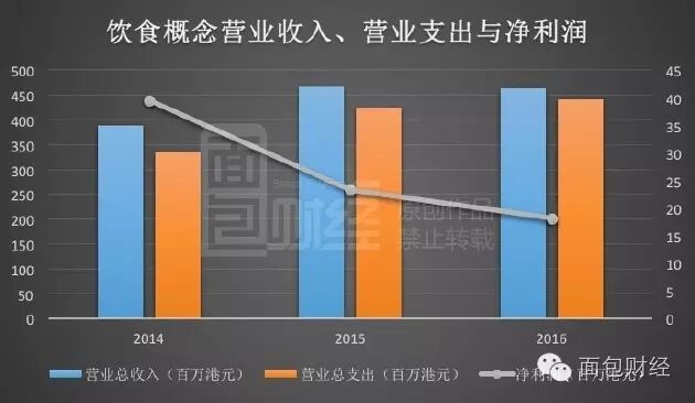 在租金和厨师等成本节节走高的背景下,香港高档餐厅的消费前景却很不明朗。据香港旅游发展局资料,2015年酒店外的旅客餐饮支出仅增长0.8%,而在2014年这一数字为7.3%。多重压力之下,餐饮概念过去三年业绩持续下滑,以下是面包财经(微信公众号ID:mbcaijing)根据招股书整理的利润走势图: