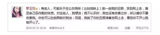 因为被网友偷拍将照片发在网上,凤姐特别愤怒,还发文狠狠批斗了这位网友。很意外的是,这次她受到了广大网友的支持。