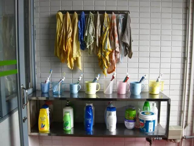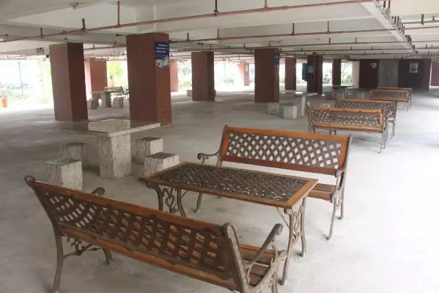 宿舍楼下的空架层设有桌凳,家长可在规定时间内送饭过来这里与小孩共同进餐