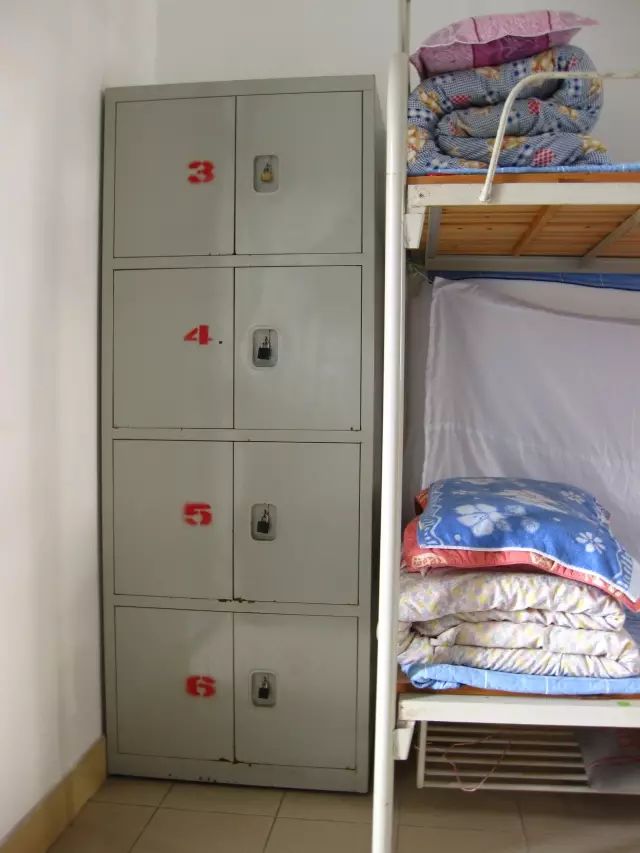 每个宿舍都有空调、电话机、储物柜、热水刷卡机。