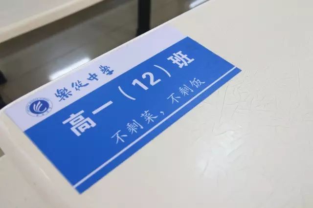 每张饭桌上都贴着各个班的标签,学生按标签的提示就坐,有效保持良好的秩序。