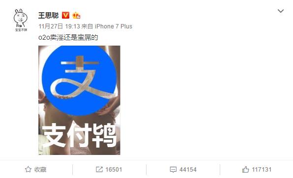 然而,支付宝此次在社交上的跨越,被讽刺成为了“支付鸨”。甚至“国民老公”王思聪还在其微博上点评称,“O2O卖淫还是蛮屌的。”