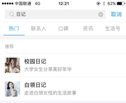 记者实测发现,在支付宝APP首页搜索“日记”即可看到“校园日记”、“白领日记”两个推荐圈子。