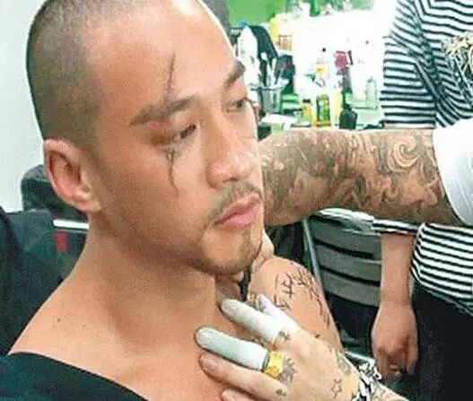 左眼的疤痕好狰狞,超过10厘米深深的刀疤真是将往日偶像形象彻底毁灭。隐约可以看见肩膀上的正字。