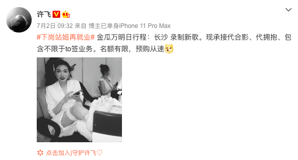 浪姐二公即将开战,被淘汰的许飞最新的身份是#下岗站姐再就业#。