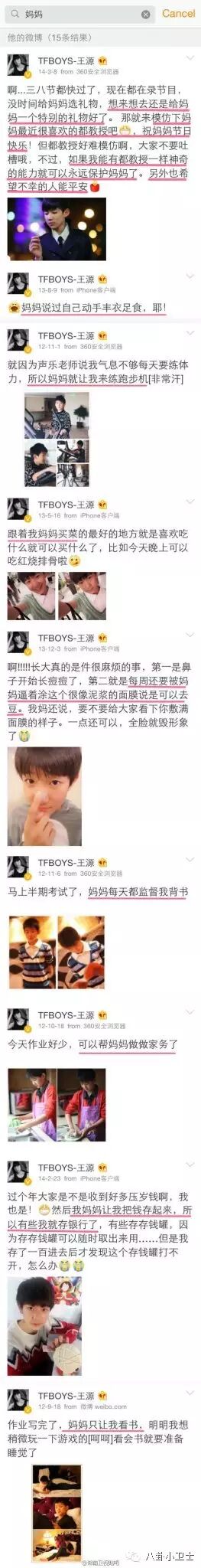 他疼爱妈妈,宠爱妈妈。由于时常有通告不能天天在家,怕妈妈会寂寞,于是他养了嘟嘟,让嘟嘟代替他不在家的时候陪伴妈妈玩儿。在私人行程中,为了保护妈妈,不使其曝光在镜头之下,他会亲自上前和前线说这是我妈妈,你们不要拍她。在难得的休息时光里,他会陪妈妈逛街,到庙里祈福,去滑雪场滑雪。在家里呆着的时候,会和妈妈一起做家务,一起学习。他啊,虽然只有十五岁,但是他做的每一件事都会顾及妈妈的感受。这个年纪的男孩子本应该满是傲娇,任性。可是他却如此温暖,贴心,单纯,善良,懂事,他是周妈妈的骄傲,同时也是我们的骄傲。很庆幸能喜欢上王源。