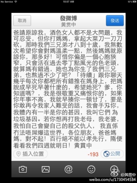 今天黄贯中晒了一张长微博截图,痛斥父亲。说爸爸是老色鬼,拿刀砍老妈甚至还打朱茵。句句愤恨,感情爆发至最高点时撂下狠话“如果你年事不高,我早揍你一顿了,要是你再敢令我家人难受的话,我会手刃你。若你在想打我老妈、我老婆,我怕自己会变自己的杀父仇人。”小伙伴们都惊呆了。