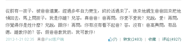 卦总翻看paul的微博,发现其实早在去年2012年1月22日的微博中,他就以一段小故事暗指亲生父亲无德。但当时事情应该没有糟糕到如此地步。↓