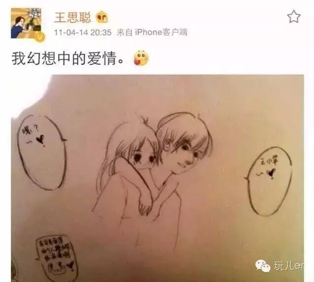 那时候的思聪还是纯情少年一枚,憧憬纯爱,待人和气,沉浸在爱恋的喜悦中。王颖生日的时候,思聪还专门画了一副漫画表达心意,他叫王颖“王小笨”。完全玛丽苏男主附体