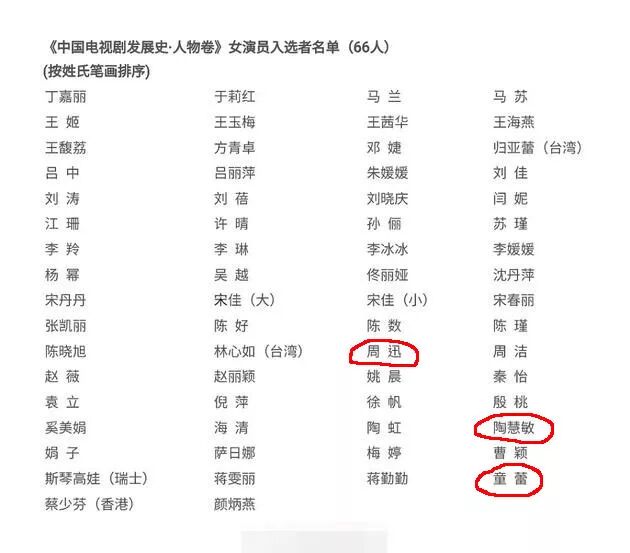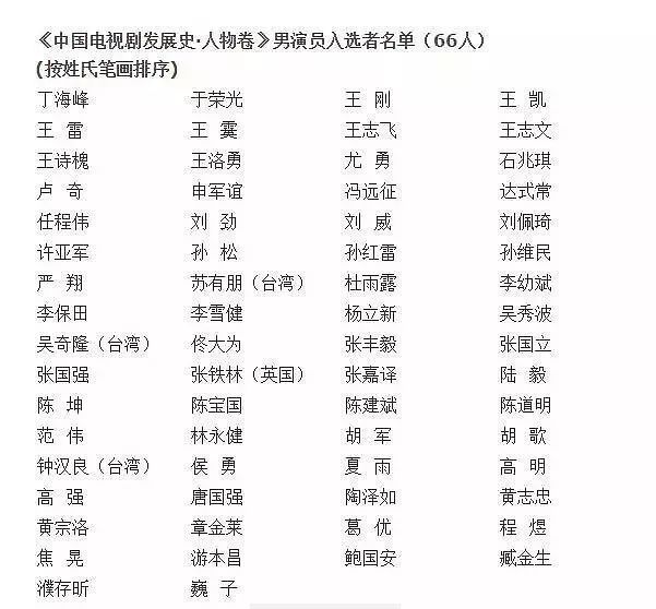 经中国广播电影电视社会组织联合会认真遴选、审核推荐,总局领导确定,推荐以下132位(男女演员各66位)演员入选《中国电视剧60年大系·人物卷》。