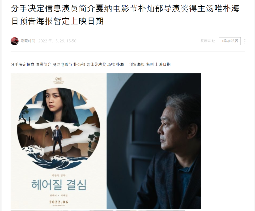 消失的汤唯,已经称霸了韩国 腾讯娱乐 内地女星 2022-06-01 20:14:23 510 创作不易,用心坚持,欢迎请BaGua喝几杯爱心咖啡!打赏并支持本文 打赏并删除本文 点击上方“腾讯娱乐”并关注,在这里读懂娱乐圈谁是当下最有国际影响力的中国女演员? 汤 唯 在刚结束不久的第75届戛纳国际电影节上,汤唯可以说是万众瞩目。 由韩国重量级导演朴赞郁为汤唯量身定做的电影《分手的决心》,让所有人满怀期待。 虽然老演员汤唯无缘获奖,但是汤唯这次戛纳现身确实引起了一定的波澜。 这个时候,大家才意识到,好像很久没有在内娱资讯里看到汤唯的名字了。 但是,据调查,汤唯已经成了韩国的国民女神。 如果说成龙是日本人的“大哥”,那汤唯就是韩国人心中的“女神”。 2014年韩国采访,油管机翻“韩国女神” 你根本想象不到汤唯在韩国到底有多火。 打开韩国网民常用的论坛Naver,搜索汤唯的韩语名字“탕웨이”,你会发现韩娱的大部分讨论帖子,都与最近汤唯拿下戛纳电影节的事件有关。 韩国网页机翻 相反,朴赞郁携手汤唯参加戛纳电影节,中国的观众并没有太大反应,冷冷清清,只有一个热搜。 但是,如果你把视线转移到韩媒评论区,就会发现韩国观众一下子就变成了汤唯的“迷妹”。 汤唯是一个很有魅力的女演员。祝你在韩国事业有成。也祝你的家人幸福。汤唯,有很多韩国人支持你。(机翻) 也有观众表示汤唯是靠演技在韩国出彩的。 演员虽然不漂亮 但是汤唯的目光很敏锐。(机翻) 但众所周知,韩国的娱乐产业极其发达,从10年前的东方神起、少女时代,到现在的Black Pink,以及不断涌现的知名艺人演员。 汤唯作为一个外国演员,想要在韩娱的三千里江山里分到一亩三分地,十分困难。 但出人意料的是,汤唯在2015年成为SK-II的韩国地区代言人。 注:这里的国内指韩国国内 在韩国代言SK-II的明星必须是国民级别的明星艺人,比如《神话》里的女主角金喜善、李沇熹。 从左往右:韩国著名主持人Eric Nam、韩国人气女星李沇熹、汤唯、SK-II全球总裁Markus Strobel 除了化妆品代言,三星的财阀们也突然发现了汤唯这位来自中国的女星具有无穷的魅力。 2011年,汤唯主演的韩国电影《晚秋》在韩国大火,三星电子当机立断邀请汤唯主演款新型智能电视MV广告。 上一个能在韩国制造火爆热潮的华人明星是张国荣,巧克力公司花重金聘请张国荣当其代言人。 随后在《请回答1988》《请回答1994》中,我们可以看到不少关于张国荣的梗。 八九十年代的韩国,如果夸小伙长得帅,会直接说长得像张国荣。 而在现在的韩国,如果夸小姑娘长得漂亮,会直接说“你长得像汤唯”。 汤唯的美甚至在韩国引发了“汤唯”的热潮。 来自中国的汤唯则是靠着自己的地域优势一举夺下韩国“最受欢迎女演员”殊荣,成为韩国人心中的“女神”。 “有一种来自中国江南水乡独有的女性的温婉、知性。” 现如今最火的韩国女团black pink的团队门面金智秀Jisoo在一档访谈节目里,聊到自己刚刚出道时,就曾被身边朋友说长相酷似汤唯。 (来自微信图片翻译) 网友们也惊呼,金智秀真的很像“汤唯”,纷纷找出对比图。 从某个角度上来说,金智秀确实有点神似汤唯,但是始终缺少汤唯身上独有的气质和知性美。 有这么一张动图,被称为“最美微笑”,和商业表情不同,汤唯的微笑是一种全身散发出的自信之美,不做作。 汤唯成为韩国国民女神这件事儿,有些无聊的韩国媒体则表示:“汤唯的美是因为使用了韩国的化妆技术。” 他们专门把汤唯来韩国前后的照片做了对比,誓要证明汤唯的美是韩国的化妆技巧所赋予的。 郑泉水,韩国知名化妆师 但是你如果仔细观察这些对比图,就会发现韩国这些文娱八卦报纸,只不过是抓拍了汤唯一些角度刁钻的丑照来做对比。 其实我们也能从这个事件上看到汤唯到底有多火,连韩国媒体都想把汤唯强行“韩国化”。 但是真正让韩国民众们拜倒在汤唯石榴裙下的是汤唯主演的一系列电影。 《色戒》让28岁的汤唯一夜成名,也让汤唯从内娱一夜消失。 汤唯确实消失了一段时间。 没有文件的“封杀令”让汤唯离开了内娱的视野,在李安的推荐下前往英国伦敦音乐戏剧艺术学院留学深造。 汤唯在图书馆和粉丝合影 2010年,沉静两年的汤唯带着一口伦敦音低调回归,以至于在那段时间里,汤唯这段留学经历成为当年留学中介的金牌文案,汤唯一时间成为“励志女神”。 而当时,国内的娱乐圈对汤唯的回归都只持观望态度。 谁也没有想到,电影《晚秋》成为汤唯人生中一个重要的发展转折点。 汤唯饰演的安娜是一个因为过失杀人而被判入狱的华人女子,因为母亲过世获得三天探亲假期。 在公交车上,她邂逅了韩国演员玄彬饰演的情场骗子勋。 一个是弑夫假释的女犯,一个是专门“吃软饭”的情场骗子,两个人互相隐瞒身份,在短短三天内谈了一场浪漫恋爱。 在母亲的葬礼上,有这么一场戏:安娜遇见了背叛自己的初恋情人王晶,再也无法忍受王晶的虚伪,爆发了。 汤唯就此打开了亚洲另一个电影工业成熟且发达的市场,韩国。 汤唯获得了第47届韩国百想艺术大赏“最佳女主角”奖,成为韩国首位获得该奖的外国女演员。 2015的韩国釜山国际电影节上,也是首次由中国演员汤唯担任主持人。 事业上升的汤唯,早已将人生下半场扎根于韩国,《晚秋》导演金泰勇与汤唯在拍摄电影时结识,